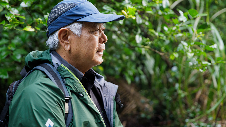 さっそく訪れたのは、国頭村の「比地大滝(ひじおおたき)キャンプ場」。遊歩道が整備され、川遊びなどのアクティビティもできるため幅広い層に人気のトレッキングコースです。ガイドを担当してくれたのは「OKINAWA NATURE OFFICE」の野鳥・自然ガイド、嵩原 建二(たけはら けんじ)さん。宮古島の出身で、琉球大学農学部を卒業後に沖縄県立博物館などに勤務され、現在も研究や書籍の執筆なども手掛ける野鳥の研究家です。