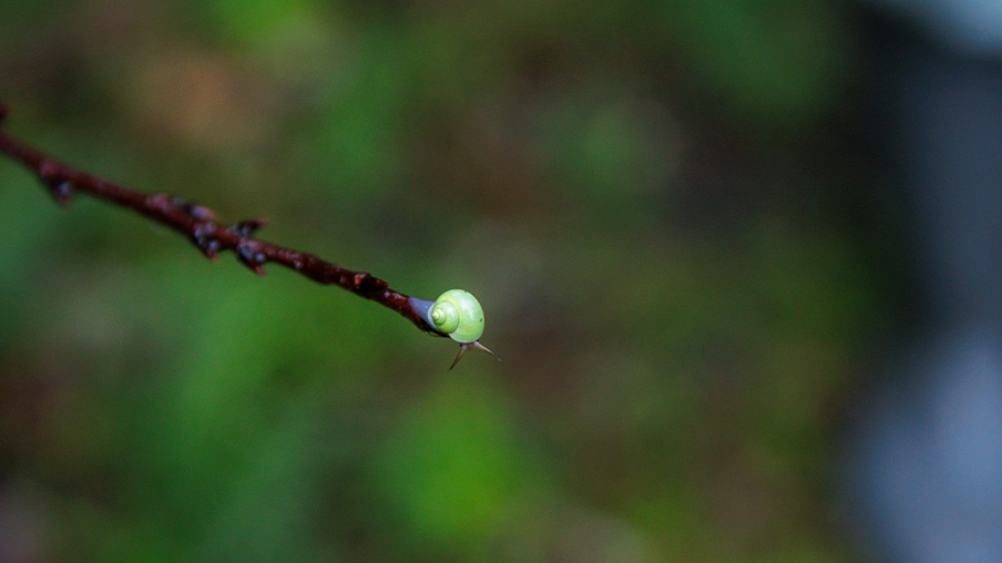 嵩原先生のガイドはわかりやすく、土地の歴史や文化との関わりも教えてくれる。/天然の森は4つの階層で構成されているのがよくわかる。/可愛らしいアオミオカタニシも一生懸命生きている。/幸運にも、1970年に天然記念物に指定されたホントウアカヒゲの雌が目の前にとまる。/25m以上の高低差はなかなかの迫力。流れ落ちる清流の音が心地良い。