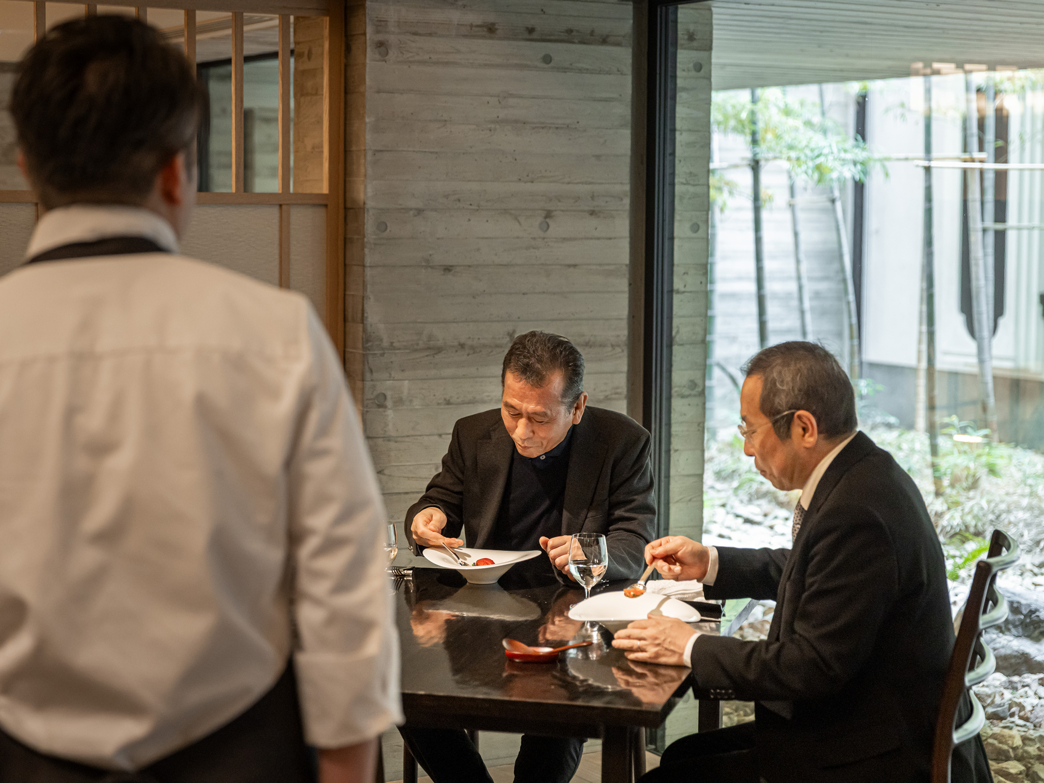 中村外二工務店は、京都市内から車で北へ向かった大徳寺のすぐそばに構えています。「THE HIRAMATSU 京都」の料理人たちと伺うと、工房のなかでは20代の若手から70代のベテランまで、職人たちが黙々と手を動かしていました。数寄屋建築に欠かせない北山丸太や樹齢を重ねた一枚板などの希少な木材が整然と並び、カンナやノミの音が響きます。一流の技を見て、「さまざまな素材を組み合わせながら、ひとつの世界を生み出すという点は料理にも通じますね」と、「リストランテ ラ・ルーチェ」の料理長、筒井 崇海(つつい たかうみ)の眼差しも真剣です。