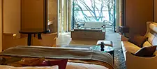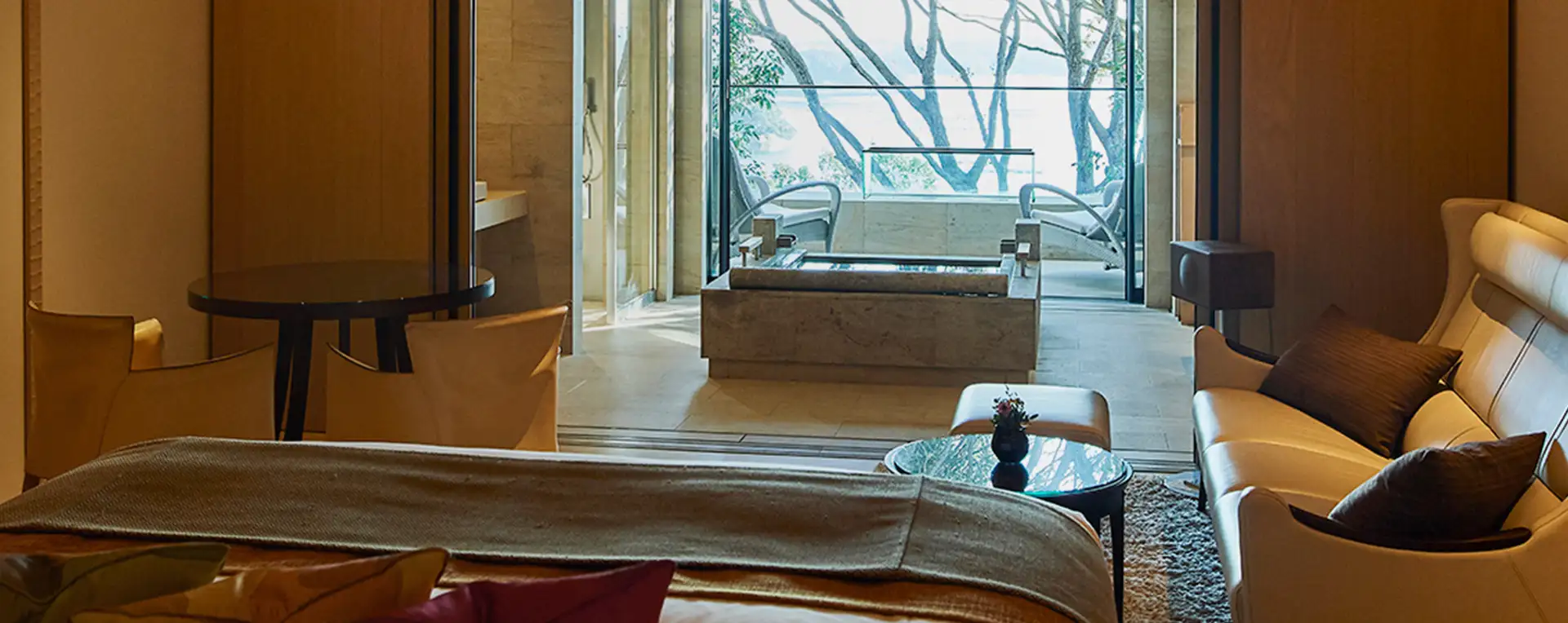 シンプルでモダンなインテリアが彩る上質な空間。窓の向こうには風光明媚な英虞湾の景色が広がり、自然に囲まれながらゆったりとしたプライベートな時間をお過ごしいただけます。